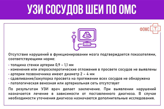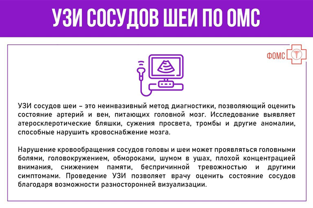 УЗИ сосудов шеи по ОМС date_range30-10-2025, 10:41 visibility7 Как, при наличии медицинских показаний, получить направление на УЗИ сосудов шеи по полису ОМС? В каких случаях оно показано и каковы показатели нормы при таком исследовании? thumb_up0thumb_down