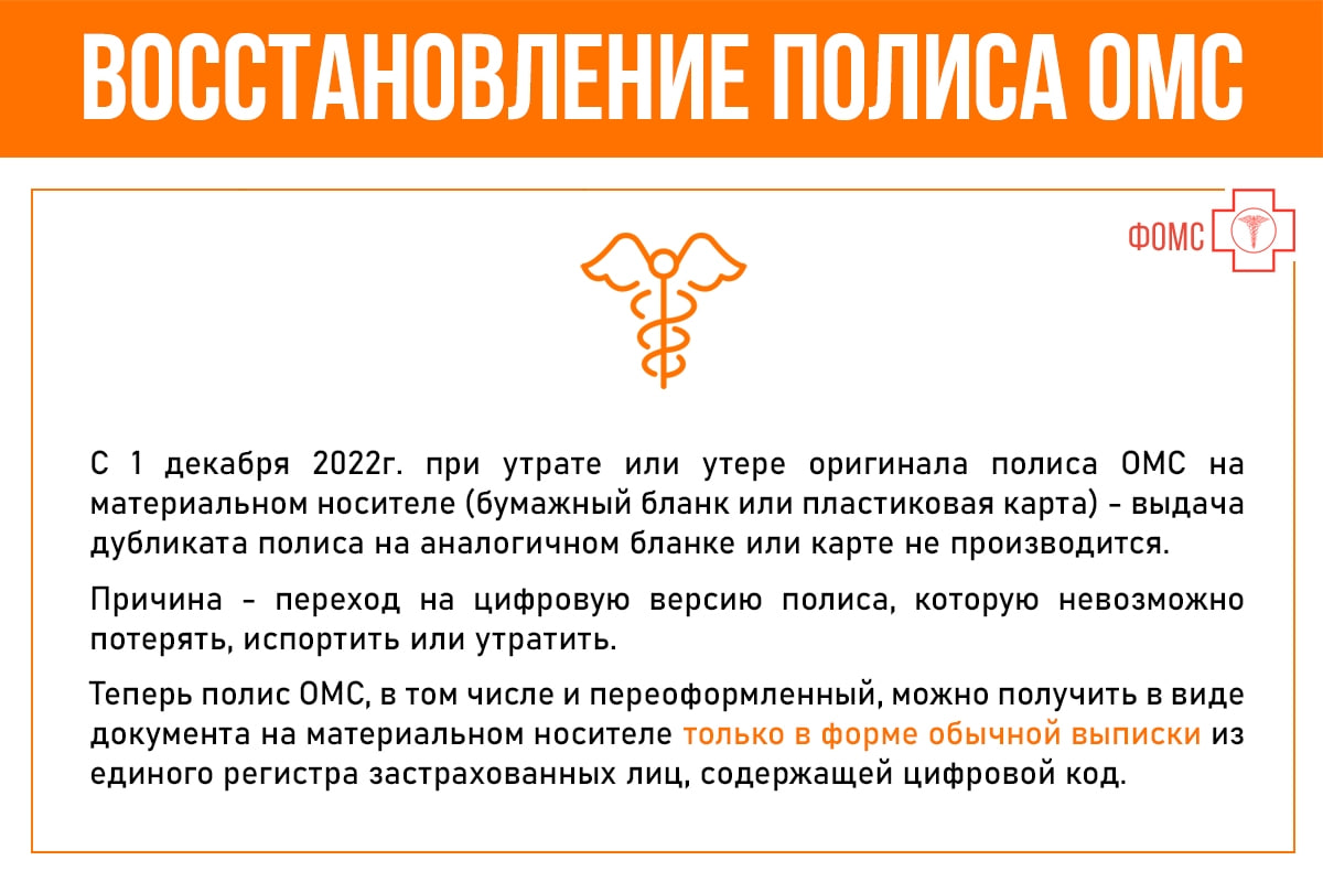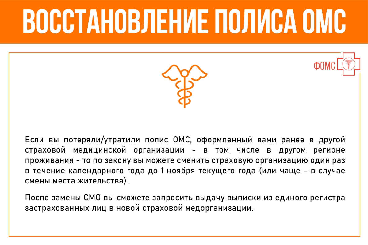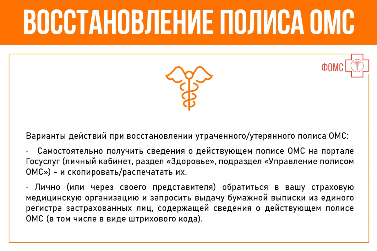 Восстановление полиса ОМС date_rangeСегодня, 09:45 visibility1 Как можно восстановить полис ОМС при утрате или утере? Что делать в подобных случаях застрахованному? thumb_up0thumb_down